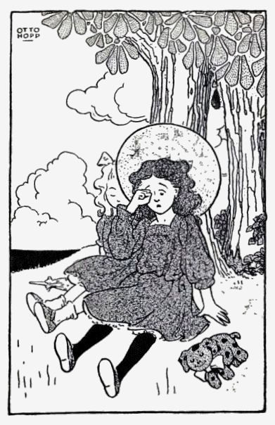 Margaret was a rather tall little girl, with brown eyes and brown hair and red cheeks, while Frances,[Pg 12] who was not quite so tall, had light hair and hazel eyes and pink cheeks, as well as a band of freckles all across her nose. Both of them were wearing that morning their pink dresses and flowered hair-ribbons—a very fortunate circumstance, as it turned out. Margaret also wore a wide-brimmed straw hat, while her sister carried instead a pink-and-white parasol—one of her last birthday presents. She took with her as well another of her birthday presents: a yellow plush puppy with black spots, Periwinkle by name, whose legs were like sausages, whose eyes were glittering black beads, and whose red worsted mouth was set in a perpetual smile.