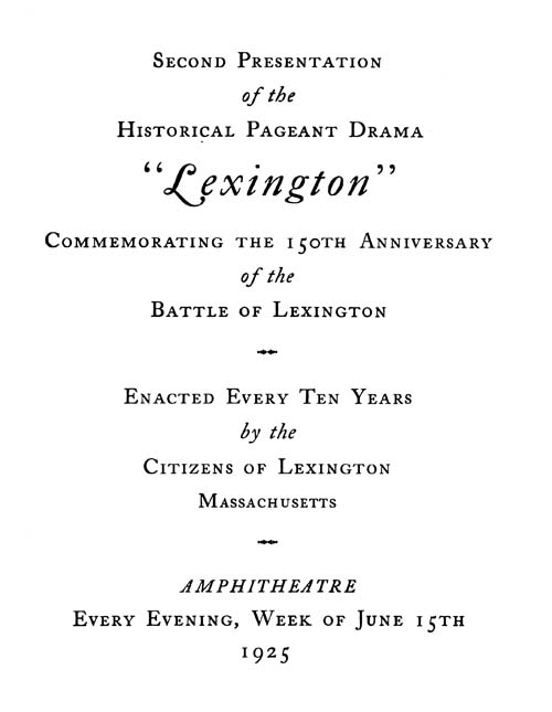 THE citizens of Lexington, the Birthplace of American Liberty, realizing they are custodians of America’s greatest shrine, extend a welcome to EVERYONE, not only on the 19th of April and Pageant Week, June 15th to 20th, 1925, BUT EVERY DAY OF THE YEAR, to visit our battlefield, the historic buildings, and at all times to feel at home. This historic spot belongs to the Nation, and we want all Americans to feel they are part owners so that on leaving the town they may have a better realization of the struggles made by our forefathers and become better and more patriotic citizens.