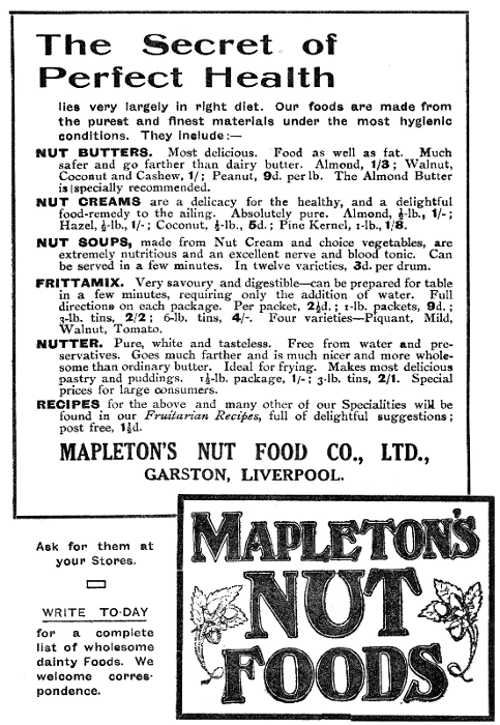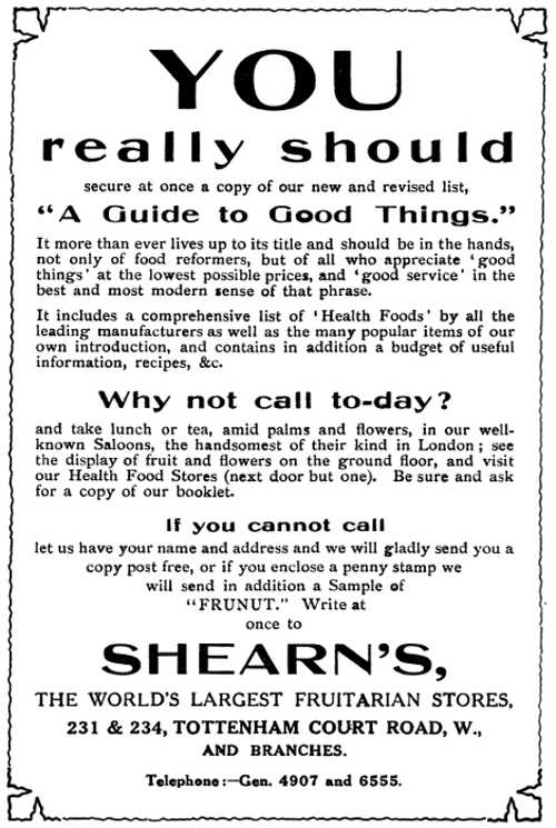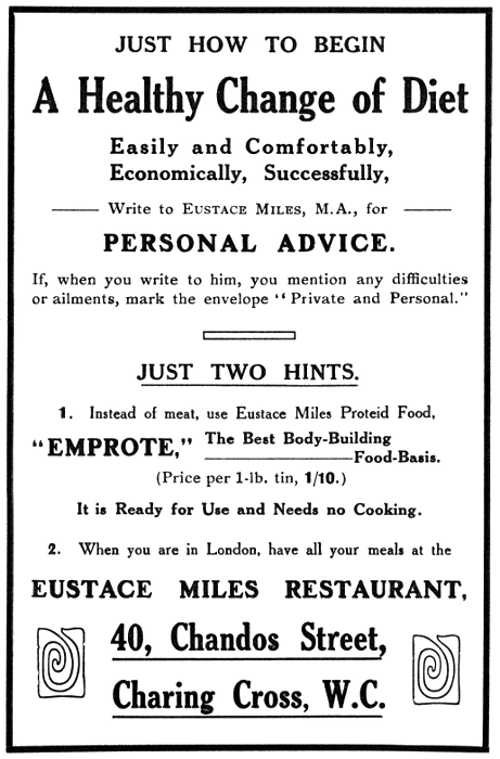 Personal Testimony.Nineteen years of abstinence from flesh-food (practised without any illness, and resulting in increased strength, stamina and health), and of observation and experiment during that period, combined with the knowledge obtained through helping hundreds of men and women to regain health by reforming their habits of living, have convinced me that a well selected fruitarian dietary, thus supplemented, will prove beneficial to all who desire physical and mental fitness. Temporary difficulties may be experienced by some in adopting such a simple style of living, or in obtaining adequate provision in their present domestic conditions; mistakes may be made—certain necessary elements being omitted from the new diet—and temporary failure may sometimes result in consequence; but if some preliminary study and consideration are given to the matter, and variety in the food is secured to ensure complete nourishment, success is easily obtainable.