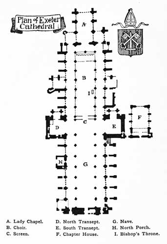 The present cathedral church of the diocese of Exeter may be said to be the third building that has stood on the site. Nothing remains of the Saxon church elevated to the dignity of a cathedral when the bishopric was removed from Crediton, and of the Norman church erected by Warelwast, a nephew of the Conqueror, only the two massive towers are standing, the remainder of the building belonging almost[Pg 35] entirely to the late Decorated style, of which it is one of the most beautiful examples we possess.