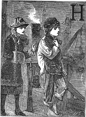 Meanwhile little Nelly, who had become stiff and cramped with cold, followed at a little distance, taking care, however, that Benny did not get out of her sight. On reaching the bridge that led down to the landing-stage, Benny turned round, and, seeing his sister behind, shouted back,