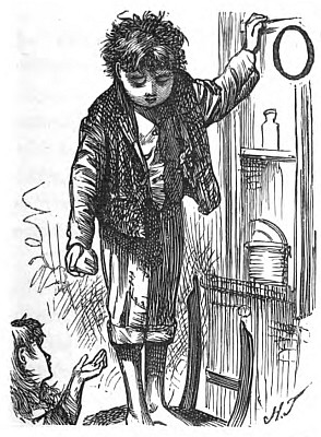 "For what you please to give," said Benny sturdily. "Times is bad at present, and little chaps like us is glad to 'ave what we catches."