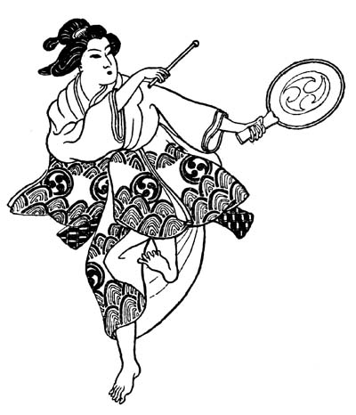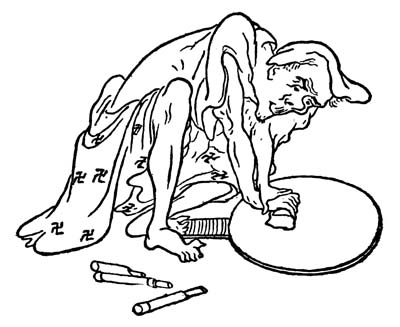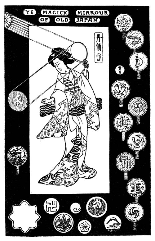 IN old Japan the mirror occupies a peculiarly important place. Travellers in that land of strange arts and quaint customs tell us of mirror-worship as one of its forms of primitive religion. In old Japan the mirror is not, as in our Western civilization, a mere article of furniture, an accessory of the toilet, or a means for covering up the otherwise indecorate breadth of wall above a mantel-piece. One finds the mirror in Japan surrounded with pomp and circumstance on every hand. It is prominent amongst the symbolic objects that constitute the imperial regalia of the Shogun. One sees it depicted in Japanese[10] pictures of the infernal regions. In the temples of the old Shinto religion, precious old mirrors are enshrined in costly arks, only to be exhibited on the occasion of some great ceremony. Innumerable mirrors, some of them of old date, but mostly of modern manufacture, are to be found hung upon the walls of the Shinto temples. There they have been deposited as votive offerings by women who had perhaps nought else so precious to offer. As the Japanese warrior offers as a votive gift to the temple his cherished sword, so the Japanese lady bestows her treasured mirror. There they hang in thousands, swords and mirrors, side by side, thank-offerings to the gods. In the scant furniture of the Japanese ménage, the mirror, reposing in its place upon the lady’s toilet-table, forms the one significant object; the central feature to suit which all the rest is subordinated. The mirror enters into the myths of the Japanese race: it is the emblem of light, or the sun, and of the divine right of the dynasty. In the trousseau of the bride the mirror is the most precious object—her one cherished possession. The first-made mirror—or the one[11] held to be such in the estimation of the Japanese, and venerated accordingly—is enshrined in the great sacred twin-palace at Isé, the holy spot to which pious pilgrims turn their steps with devoted zeal. Its origin is related in the famous myth of the sun-goddess, Amaterasu oho-mi-kami, who, on one occasion, withdrew offended to a rocky cavern, leaving the world in darkness. From this retreat she was enticed by the other gods, after many curious artifices had been tried, by their successful making of a mirror, in which seeing her face reflected, she was impelled by jealousy and curiosity to venture forth. This mirror was fashioned by the Vulcan of the Shinto Olympus to imitate the sun, being in shape a disk with eight rays. In modern Japanese heraldry the sun, as blazoned upon the national flag, is a red orb with sixteen red rays, not pointed as in European heraldry, but widening out to the margin of the flag. Some hold that the Japanese imperial crest, the kiku, which resembles a flower with sixteen petals joined and rounded at the outer extremities, and issuing from a small central disk, is also a blazon of the sun; others hold it to[12] represent the chrysanthemum. In Japanese pictures of the sun-goddess myth, the mirror is always represented as of the eight-point form. Tradition states that the flaw still to be seen in its surface was caused by a blow it received when the gods thrust it into the half-opened doorway of the rocky cavern as the sun-goddess peeped out. The standard version of the entire myth is to be found in a memoir on the Shinto Temples of Isé by Mr. Ernest Satow, in the second volume of the “Transactions of the Asiatic Society of Japan” (1873-74). In the British Museum, in Dr. Anderson’s collection of Japanese drawings, No. 1905, there is a silk roll painted in colours, depicting the scene outside the cavern. It is without signature or seal, and the artist is unknown. A further myth narrates the subsequent history of the mirror. It was handed by the sun-goddess to her grandson Nini-gi no mikoto when he descended from heaven to subdue the earth, along with the sacred sword and the sacred seal-stone (the three sacred treasures of the Japanese regalia), with these words: “Look upon this mirror as my spirit: keep it[13] in the same house and on the same floor with yourself, and worship it as if you were worshipping my actual presence.” Nini-gi no mikoto founded the empire of Japan, and is worshipped as the first Shogun, all subsequent sovereigns claiming divine right by descent from him. All mirrors in Shinto temples, whether exposed to view or concealed in shrines or arks, are imitations of this one, though some are regarded as being representative of other secondary deities. At Isé, where the first mirror is preserved, each mirror is enclosed in a box standing on a stand, and covered with a cloth of silk. The mirror is itself wrapped in a brocade bag, which is never opened or renewed, but which, when nearly worn out, is enclosed in a new bag. Over the numerous wrappings is a cage of wood with gold ornaments, draped with a curtain of coarse silk. At festivals, when they open the shrines, all that can be seen is the boxes with the coverings over them.