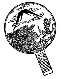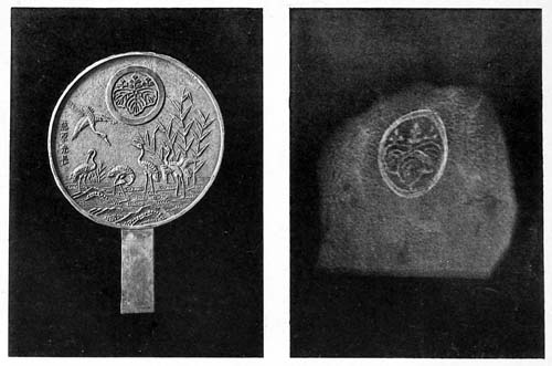 The mirror of old Japan is however a very different article from that known in modern Europe as a mirror. European mirrors are[14] made, as everyone knows, of glass silvered at the back. Japanese mirrors are invariably made of metal, the bronze employed being a compound of copper and tin, with traces of antimony or lead.[1] The mirrors preserved in the temples are not all of the eight-pointed form. Some are simply circular, with a thick rim behind, and a central button perforated to receive a suspending cord; the front being quite plane. Others are oval, with feet, or with perforated handles at the upper part for suspension. In the houses square mirrors are very rarely met with, and these are mostly small. Those for the lady’s toilet table are usually circular, from four to five inches across, without handles, possessing a thick rim and a raised pattern on the back. Commonest of all are the hand-mirrors, which are usually circular, from three to eleven inches in diameter, with a metal handle covered with bamboo or with brocade. They are usually slightly convex on the front surface, which is brightly polished; while the back, which is for the[15] most part unpolished, exhibits a fine raised pattern. Often the raised ornament consists of two distinct kinds. There is made in high relief, and polished bright so as to stand out from the background, a simple bold symbolic device, sometimes a Chinese character signifying “good-luck,” or “long-life,” sometimes a family crest, such as the imperial kiri (or Paullonia leaves and flowers), or a circlet, or three feathers crossed, or the jagged peak of Fuji-yama, or the outline of a bird. Ornament of the second kind is in low relief, and, though often symbolic, consists of naturalistic representations of trees, flowers, storks, bamboos, and the like. A group comprising pine-trees, storks, and the hairy-tailed tortoise, all symbols of longevity or immortality, is a favourite one. Sometimes the ornament consists exclusively of one or other of these kinds; but more frequently both are present; the unpolished low-relief work forming an artistic background for the crest or the Chinese letters, which stand out polished. In passing it may be remarked that the Japanese make use of Chinese characters in addition to their own form of writing,[16] just as we still use old English black-letters for ornamental or distinctive purposes.