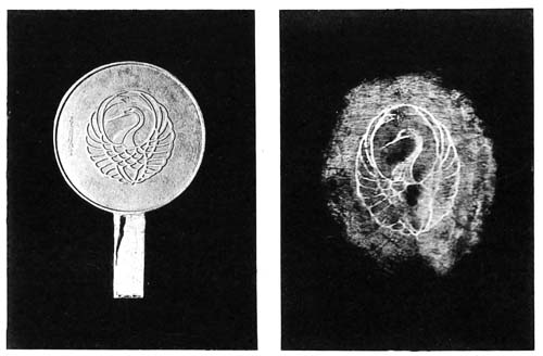 Plate I. depicts a mirror in the author’s possession, about 7 inches in diameter, the back of which bears in high relief a crest in the form of a bird (hoho). The casting has evidently been tooled up to give greater sharpness, and the part in high relief has been ground and polished. The pattern which this mirror casts from its face is shown beside the mirror, both being photographically reproduced. This mirror shows the pattern with sunlight, or with the light of the electric arc, or with lime-light. It can also be shown to a few persons at a time by means of the flame of a paraffin lamp twenty feet away, or even by the light of an ordinary candle a couple of feet away. In the case of these weaker sources of light the mirror must be held close to the white screen or card upon which the image is to be received.