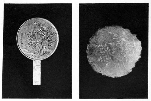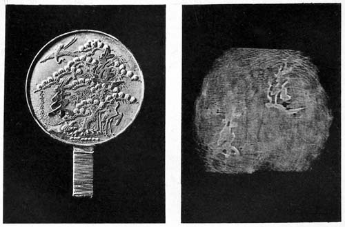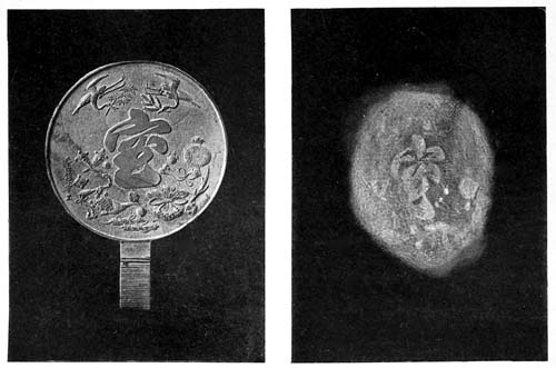 Plate V. shows a mirror which has two Chinese characters in high relief, polished, with a background made up of symbols of longevity—pine-tree, two storks, and a hairy-tailed tortoise. But though these are in almost as high relief as the polished letters, only the former are to be distinguished in the image. Here again the author conceives that the two letters have been polished down subsequently to the face; the pattern of these parts having been thus, to a minute degree, forced into the reflecting surface.