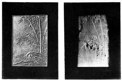 Plate VI. depicts a rectangular mirror, 15 inches high by 10½ inches wide, and weighing 5½ lbs. It is the only one of this form that he has seen or heard of; though smaller square mirrors of 3 to 4 inches in the side are not infrequent. One of the latter, in his possession, an old mirror covered at the back with Chinese characters, has no magic qualities at all. The large rectangular mirror is slightly convex, but more so in its longer direction than in its breadth. The bamboos in the pattern, though[37] not very highly raised, are in very sharp relief, the mirror being, apparently, an ichi mai buki, or artist’s proof. There are two raised lumps on the back, apparently the remains of the parts where the metal was poured into the mould; and, curiously enough, neither these nor the rims of the rocks in the foreground yield any image, though they are more highly raised than any part of the bamboos.