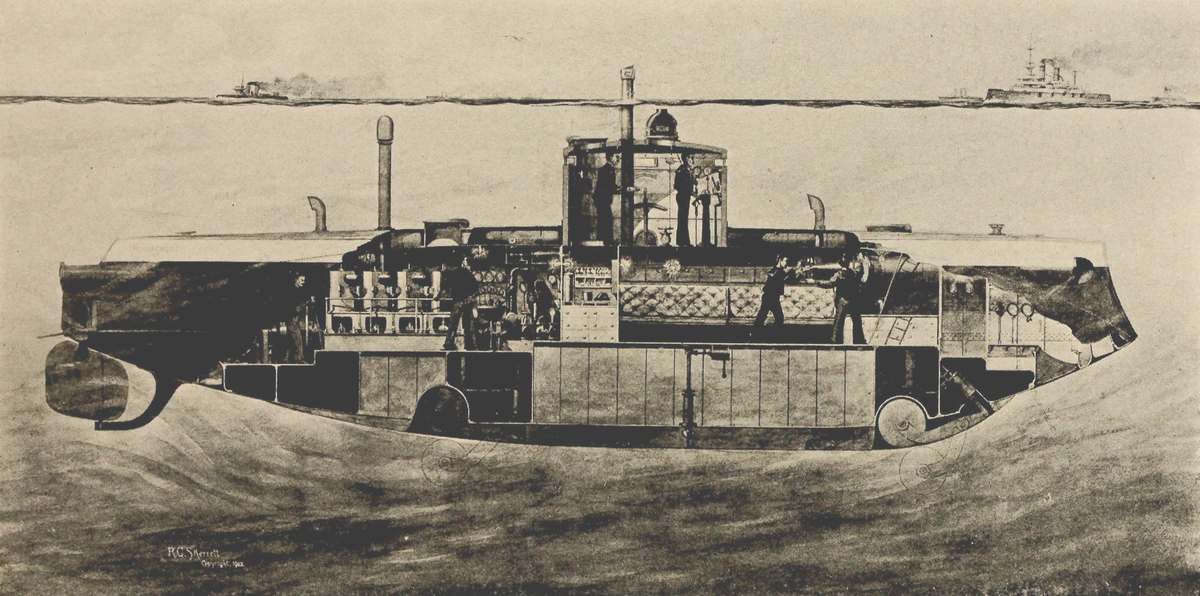 There have been published one or two good works dealing with this subject in a very complete and intelligible manner, but intended for those engaged in engineering pursuits.[viii] One of the best of these was "The Evolution of the Submarine Boat, Mine and Torpedo, from the Sixteenth Century to the Present Time," by Commander Murray F. Sueter, of the Royal British Navy, published in 1907.