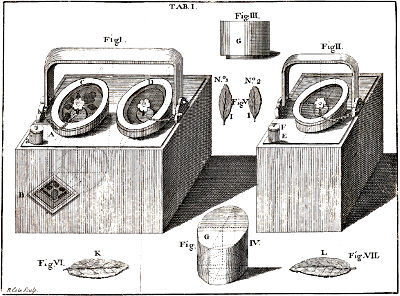 Fig. I. Represents a Kind of Kettle, curiously made of Chinese Copper, furnished with a Handle, divided by a Copper Partition; and which, though at first View, it appears to be one Vessel, is yet, upon narrower Inspection, found to be two, with two Coverings; for A represents a small Furnace, into which the Coals are put; and B, the Mouth of the Furnace, covered with Cross-Bars, for the better Ventilation of the Coals. The other Vessel has its internal Surface lined, or covered with Tin, serves either for drying, or boiling the Tea, and is furnished with a particular small Tube, the Cover of which is exhibited by a; by the Benefit of which, the large Coverings, C D, being shut up, the Vapours of the Tea may be retained, or allowed to exhale at Pleasure.