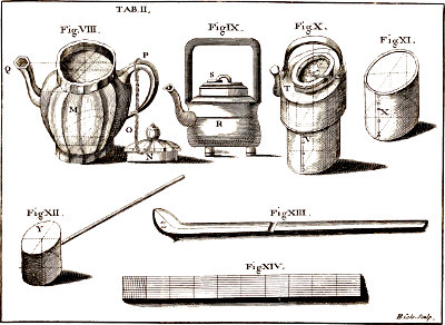 "At the Request of the learned and judicious Simon Pauli, I have delineated some of the Chinese Utensils, and hope for Indulgence, because these Vessels are neither exhibited according to the Laws of Painting, nor Perspective; but in a Manner, used by Mechanics, since I thought it expedient, both for the Sake of the Subject, and the Satisfaction of the curious Reader, to have a due Regard to Capacity, and Measure. I have exhibited the Orthography of the Vessel represented by Fig. IX. the Scenography of Fig. III. of which the Orthography is represented by Fig. IV. In Fig. VIII. the Scenography of the Vessel M, and the Orthography of its Cover N, are represented; but I have only described the Scenographies of all the rest. I have used the Rhinlandian Geometrical Foot, to the Measure of which all the Parts of these Vessels are adjusted, in that Proportion, observable in Fig. XIV. which represents a smaller Foot, divided into ten Parts. Fig. XIII. exhibits a wooden Instrument, exactly of the same Size with the Figure. In all the Figures I have represented the Length and Breadth by Diameters and Diagonals; but the Height or Depth, by pricked Perpendiculars. I hope the Mathematical Reader will find no Fault with the quadrangular Passage B in Fig. I. for conveying the Air, in order to ventilate the Coals; nor with[154] Fig. IX. the two Feet of which, shade other two similar to themselves."