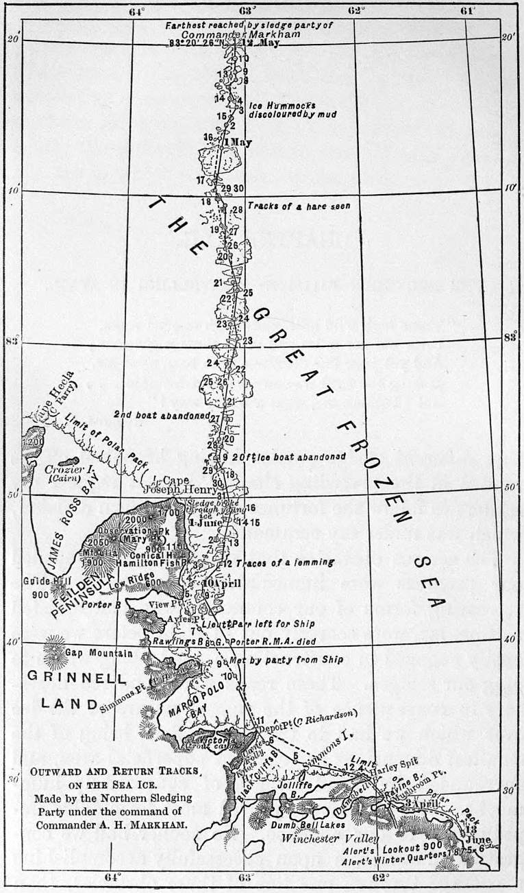 The History of the Arctic Expedition of 1875-76, and the record of its results, will be found in the work of Sir George Nares. My object in publishing the present volume is to furnish a popular narrative of memorable events as they presented themselves to an individual member of the Expedition, and especially of the work of sledge travelling over the frozen polar ocean. It was written a few months after our return to England, but its appearance has been purposely deferred until the publication of the work by Sir George Nares.