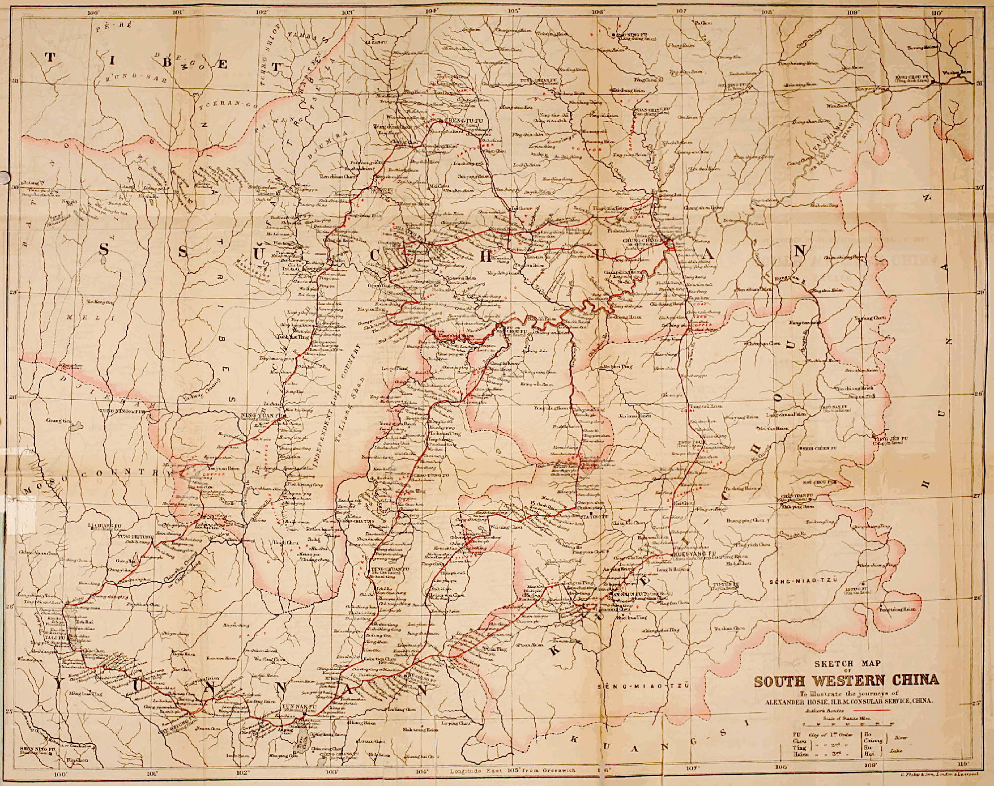 The following pages are intended to present a picture of Western China as the writer saw it in 1882, 1883, and 1884. Chapter VII., in a somewhat modified form, was read at a meeting of the Royal Geographical Society on the 22nd of February, and published in the Proceedings for June, 1886; Chapter XI. was read at the Aberdeen meeting of the British Association in September, 1885; and Chapter XII. was addressed to a special meeting of the Manchester Chamber of Commerce on the 12th of May, 1886. The remaining Chapters are now published for the first time, and, if they meet with half the favour bestowed upon the Parliamentary Papers in which the journeys were first, and somewhat roughly, described, the writer will consider himself amply rewarded for the work which want of leisure has compelled him to neglect so long.