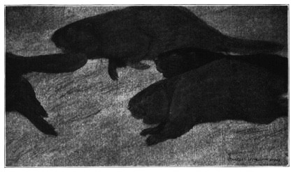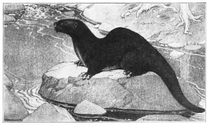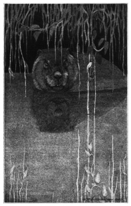 So soft was the sound that it barely reached the Boy’s ears. To the marvellously sensitive ears of the beaver, however, it was a warning more than sufficient. It was a noisy proclamation of peril. Swift as a wink of light, the beaver dropped his stick and dived head first into the pond. The Boy straightened up just in time to see him vanish. As he vanished, his broad, flat, naked tail hit the water with a cracking slap which resounded over the pond like a pistol-shot. It was reëchoed by four or five more splashes from the upper portion of the pond. 10 Then all was silence again, and the Boy realized that there would be no more chance that night for him to watch the little people of the House in the Water. Mounting the firm-woven face of the dam and casting his eyes all over the pond, he satisfied himself that two houses which he had first seen were all that it contained. Then, resisting the impulse of his excitement, which was to explore all around the pond’s borders at once, he resolutely turned his face back to camp, full of thrilling plans for the morrow.