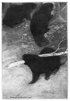 Presently he marked a black trail, as it were, moving down in the middle of the radiance from the upper end of the pond. It was obviously the trail of some swimmer, but much too broad, it seemed, to be made by anything so small as a beaver. It puzzled him greatly. In his eagerness he pushed noiselessly forward, seeking a better view, till he was within some thirty feet of the dam. Then he made out a small dark spot in the front of the trail,––evidently a beaver’s head; and at last he detected that the little swimmer was carrying a bushy branch, one end held in his mouth while the rest was slung back diagonally across his shoulders.