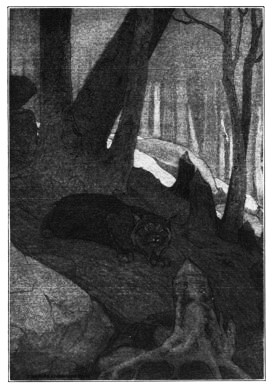 At first he could see nothing. But to his sensitive little nerves came a feeling that something was there. Gradually his eyes, accustoming themselves to the gloom, began to disentangle substance and shadow. Then suddenly he detected the form of a gray crouching animal. He saw its tufted ears, its big round face, with mouth half open grinningly. Its great, round, pale, yellow green eyes were staring straight at him.