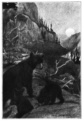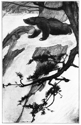 This time, however, the spell was broken by the bear himself. Suddenly he repeated his former manœuvre; and again turned to face his adversary. But the bull did not follow. Without a movement he stood, as if content with his victory. And after a few moments the bear, as if realizing that the fight was over, flung himself aside from the trail and went limping off painfully through the bushes, keeping a watchful eye over his shoulder till he vanished into a bunch of dense spruce against the mountainside.