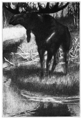 Receiving no answer to his defiance, the great bull turned his attention again to the ooze around the spring. After sniffing it all over he fell to furrowing it excitedly with the two lowermost branches of his antlers,––short, broad, palmated projections thrust out low over his forehead, and called by woodsmen “the ploughs.” Every few seconds he would toss his head fiercely, like an ordinary bull, and throw the ooze over his shoulders. Then he pawed the cool, strong-smelling stuff to what he seemed to consider a fitting consistency, sniffed it over again, and raised his head to “bell” a fresh challenge across the spacious solitudes. Receiving no answer, he snorted in disgust, flung himself down on the trampled ooze, and began to wallow with a sort of slow and intense vehemence, grunting massively from time to time with volcanic emotion.