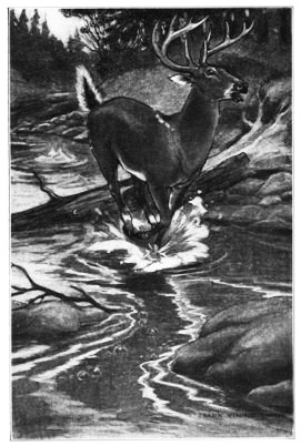 This would have been the end of the young bull’s battlings and wooings; but as his good luck would have it, it was at the very edge of the shelf that he collapsed. Disengaging his victorious antlers, the conqueror thrust viciously and evisceratingly at the victim’s exposed flank. The latter was just struggling to rise, with precarious foothold on the loose-turfed brink of the steep. As he writhed away wildly from the goring points, the bushes and turf crumbled away, and he fell backwards, rolling and crashing till he brought up, battered but whole, in a sturdy thicket of young firs. Regaining his feet he slunk off hurriedly into the dark of the 262 woods. And the victor, standing on the brink in the white glare of the moonlight, “belled” his triumph hoarsely across the solemn spaces of the night.