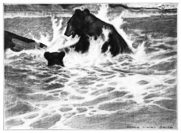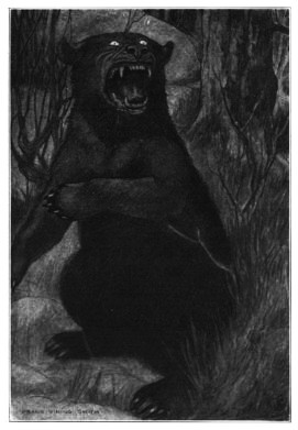 At this moment, out from the heart of the thicket 263 plunged a towering black form, with wide, snarling jaw’s agleam in the moonlight. It seemed to launch itself through the air, as if from a height. One great, taloned paw struck the young cow full on the neck, a crashing blow, shattering the vertebrae through all their armour of muscle. With a groan the stricken cow sank down, her outstretched muzzle smothered in the ooze of the wallow; and the monstrous bulk of the bear fell upon her, tearing the warm flesh hungrily.