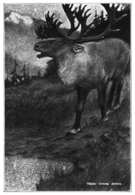 The wallow was now in the full flood of the moonlight. In that mysterious illumination the caribou, encased in shining ooze, took on the grotesque 257 and enormous aspect of some monster of the prediluvian slimes. Suddenly his wallowing stopped, and his antlers, dripping mud, were lifted erect. For a few moments he was motionless as a rock, listening. He had caught the snapping of a twig, in the trail below the edge of the shelf. The sound was repeated; and he understood. Blowing smartly, as if to clear the mud from about his nostrils, he lurched to his feet, stalked forth from the wallow, and stood staring arrogantly along the trail by which he had come. The next moment another pair of antlers appeared; and then another bull, tall but lean, and with long, spiky, narrow horns, mounted over the edge of the shelf, and halted to eye the apparition before him.