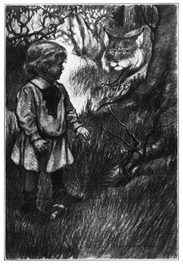 At this thought he felt a trifle reassured. Cats were kind, and nice to play with. A big cat wouldn’t hurt him, he felt quite sure of that. But when, after a minute or two of moveless glaring, the big cat, never taking its round eyes from his face, began to creep straight toward him, stealthily, without a sound, then his terror all came back. In the extremity of his fear he burst out crying, not very loud, but softly and pitifully, as if he hardly knew what he was doing. His little hands hanging straight down at his sides, his head bent slightly forward, he stood helplessly staring at this strange, terrible cat creeping toward him through the thicket.