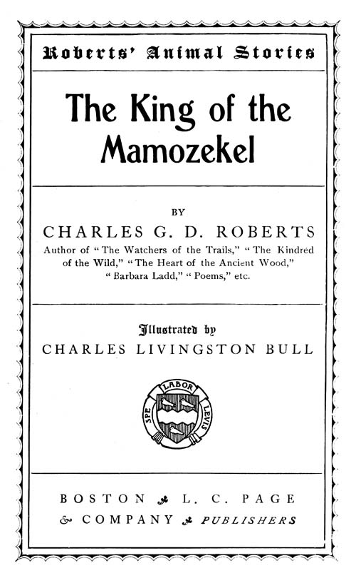 On this knoll, when the arbutus breath of the northern spring was scenting the winds of all the Tobique country, the king was born,—a moose-calf more ungainly and of mightier girth and limb than any other moose-calf of the Mamozekel.[11] Never had his mother seen such a one,—and she a mother of lordly bulls. He was uncouth, to be sure, in any eyes but those of his kind,—with his high humped fore-shoulders, his long, lugubrious, overhanging snout, his big ears set low on his big head, his little eyes crowded back toward his ears, his long, big-knuckled legs, and the spindling, lank diminutiveness of his hindquarters. A grotesque figure, indeed, and lacking altogether in that pathetic, infantile winsomeness which makes even little pigs attractive. But any one who knew about moose would have said, watching the huge baby struggle to his feet and stand with sturdy legs well braced, “There, if bears and bullets miss him till his antlers get full spread, is the king of the Mamozekel.” Now, when his mother had licked him dry, his coat showed a dark, very sombre, cloudy, secretive brown, of a hue to be quite lost in the shadows of the fir and hemlock thickets, and to blend consummately with the colour of the tangled alder trunks[12] along the clogged banks of the Mamozekel.