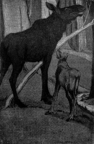 While the great cow was pasturing on birch-twigs, the calf rested, with long legs tucked under him, on the dry, softly carpeted earth beneath the branches of a hemlock. At this pleasant pasturage[22] the mother moose was presently joined by her calf of the previous season, a sturdy bull-yearling, which ran up to her with a pathetic little bleat of delight, as if he had been very desolate and bewildered during the days of her strange absence. The mother received him with good-natured indifference, and went on pulling birch-tips. Then the yearling came over and eyed with curiosity the resting calf,—the first moose-calf he had ever seen. The king, unperturbed and not troubling himself to rise, thrust forward his spacious ears, and reached out a long, inquiring nose to investigate the newcomer. But the yearling was in doubt. He drew back, planted his fore hoofs firmly, and lowered and shook his head, challenging the stranger to a butting bout. The old moose, which had kept wary eye upon the meeting, now came up and stood over her young, touching him once or twice lightly with her upper lip. Then, swinging her great head to one side, she glanced at the yearling, and made a soft sound in her[23] throat. Whether this were warning or mere pertinent information, the yearling understood that his smaller kinsman was to be let alone, and not troubled with challenges. With easy philosophy, he accepted the situation, doubtless not concerned to understand it, and turned his thoughts to the ever fresh theme of forage.