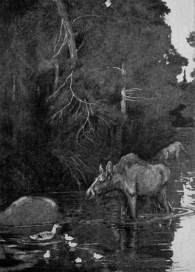 [24]By the time summer was well established in the land, the moose-calf had begun to occupy himself diligently with the primer-lessons of life. Keeping much at his mother’s head, he soon learned to pluck the tops of tall seeding grasses; though such low-growing tender herbage as cattle and horses love, he never learned to crop. His mother, like all his tribe, was too long in the legs and short in the neck to pasture close to the ground. He was early taught, however, what succulent pasturage of root and stem and leaf the pools of Mamozekel could supply; and early his sensitive upper lip acquired the wisdom to discriminate between the wholesome water-plants and such acrid, unfriendly growths as the water-parsnip and the spotted cow-bane. Most pleasant the little family found it, in the hot, drowsy afternoons, to wade out into the leafy shallows and feed at leisure belly-deep in the cool, with no sound save their own comfortable splashings, or the shrill clatter of a kingfisher winging past up-stream.[25] Their usual feeding hours were just before sunrise, a little before noon, and again in the late afternoon, till dark. The rest of the time they would lie hidden in the deepest thickets, safe, but ever watchful, their great ears taking in and interpreting all the myriad fluctuating noises of the wilderness.