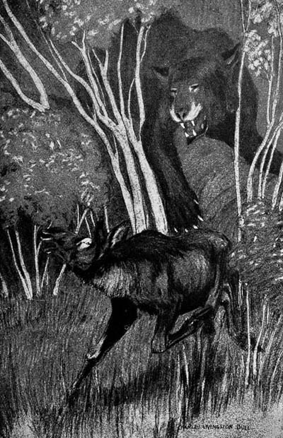 The next instant a black bulk lunged forth with incredible swiftness from the green, and a great paw swung itself with[78] a circular, sweeping motion, upon the retreating calf. In the wilderness world, as in the world of men, history has a trick of repeating itself; and this time, as on that day nine years before, the bear was just too late. The blow did not reach its object till most of its force was spent. It drew blood, and knocked the calf sprawling, but did no serious damage. With a bleat of pain and terror, the little animal jumped to its feet and ran away.
