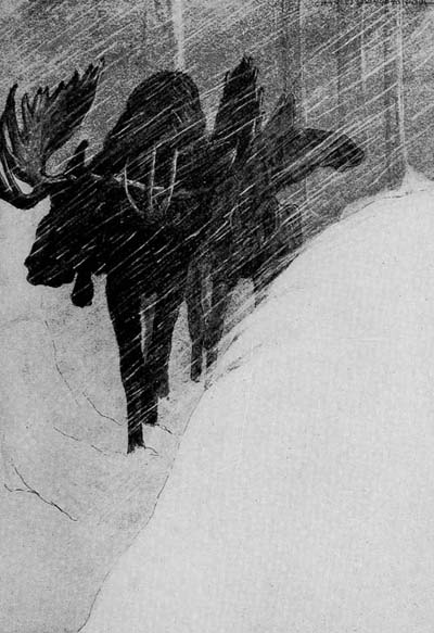 The big-antlered bull now chose his site for the “yard,” with “verge and room enough” for all contingencies. The “yard” was an ample acreage of innumerable winding paths, trodden ever deeper as the snows accumulated. These paths led to every spot of browse, every nook of shelter, at the same time twisting and crossing in a maze of intricacies. Thick piled the snows about the little herd, and the northern gales roared over the hemlocks, and the frost sealed the white world down into silence. But it was such a winter as the moose kin loved. No[51] wolves or hunters came to trouble them, and the months passed pleasantly. When the days were lengthening and the hearts of all the wild folks beginning to dream of the yet unsignalled spring, the young king was astonished to see the great antlers of his leader fall off. Seeing that their owner left them lying unregarded on the snow, he went up and sniffed at them wonderingly, and pondered the incident long and vainly in his heart.