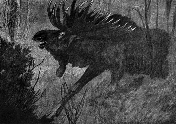 The next instant the mother moose burst from her thicket, the long hair of her neck and shoulders stiffly erect with rage. She had understood well enough that agonised cry of the young king. She paused but a second, to give him a hasty lick of reassurance, then charged down upon the covert around the windfall. She knew that only a bear could have done that injury; and she knew,[39] without any help from ears, eyes, or nose, that the windfall was just the place for a bear’s lying-in-wait. With an intrepidity beyond the boldest dreams of any other moose-cow on the Mamozekel, she launched herself crashing into the covert.