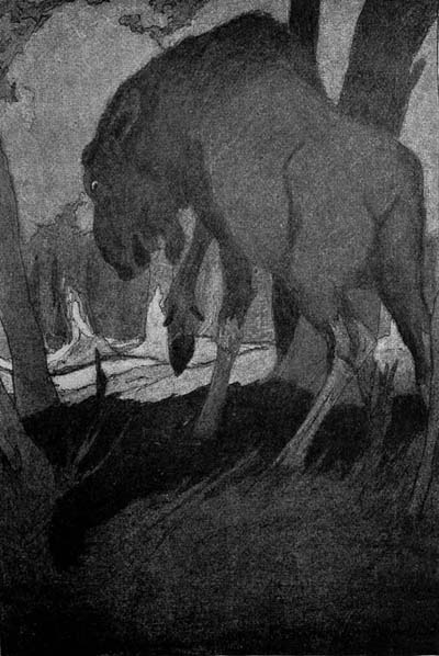 At length he came out upon the fair river basin where the Mamozekel, the Serpentine, and the Nictau, tameless streams, unite to form the main Tobique. Here he heard the call of a young cow,—a voice thinner and higher than his mother’s deep-chested notes. With an impulse that he did not understand, he pushed forward to answer the summons, no longer furtive, but noisily trampling the brush. Just then, however, a pungent smell stung his nostrils. There, not ten paces distant, was a massive black shape standing out in the moonlight. Panic laid grip upon his heart, chilling every vein. He wheeled, splashed across the shallow waters of the Nictau, and fled away northward on tireless feet.