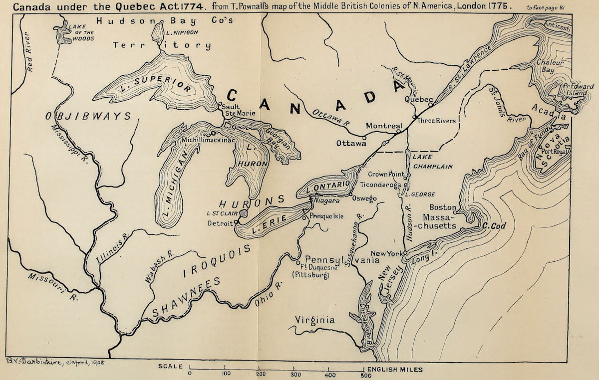After the Peace of Paris had been signed, the King, through Lord Egremont, who had succeeded Chatham as Secretary of State for the southern department, referred the whole subject of his new colonial possessions to the Lords of Trade. In doing so he called special attention to the necessity of keeping peace among the North American Indians—a subject which was shortly to be illustrated by Pontiac’s war—and to this end he laid stress upon the desirability of protecting their persons, their property, and their privileges, and ‘most cautiously guarding against any invasion or occupation of their hunting lands, the possession of which is to be acquired by fair purchase only’. The Lords of Trade recommended adoption of ‘the general proposition of leaving a large tract of country round the Great Lakes as an Indian country, open to trade, but not to grants and settlements; the limits of such territory will be sufficiently ascertained by the bounds to be given to the governors of Canada and Florida on the north and south, and the Mississippi on the west; and by the strict directions to be given to Your Majesty’s several governors of your ancient colonies for preventing their making any new grants of lands beyond certain fixed limits to be laid down in the instructions for that purpose’. Egremont answered that the King demurred to leaving so large a tract of land without a civil jurisdiction and open, as being derelict, to possible foreign intrusion; and that, in His opinion, the commission of the Governor of Canada should include ‘all the lakes, viz. Ontario, Erie, Huron, Michigan, and Superior’, and ‘all the country as far north and west as the limits of the[6] Hudson’s Bay Company and the Mississippi’. At the same time He cordially concurred in not permitting grants of lands or settlements in these regions, which should be ‘for the present left unsettled, for the Indian tribes to hunt in, but open to a free trade for all the colonies’. The Lords of Trade were not convinced. They deprecated annexing this western territory to any colony, and particularly to Canada, on three grounds: The first was that annexation to Canada might imply that the British title to these lands was the result of the late treaty and of the cession of Canada, whereas it rested on antecedent rights, and it was important not to let the Indians form a wrong impression on this head by being brought under the government of the old French province. The second ground was that, if the Indian territory was annexed to one particular province and subjected to its laws, that province would have an undue advantage over the other provinces or colonies in respect to the Indian trade, which it was the intention of the Crown to leave open as far as possible to all British subjects. The third objection to annexing the territory to Canada was that the laws of the province could not be enforced except by means of garrisons established at different posts throughout the area, which would necessitate either that the Governor of Canada should always be commander-in-chief of the forces in North America, or that there should be constant friction between the civil governor and the military commanders. This reasoning prevailed, and the lands which it was contemplated to reserve for the use of the Indians were not annexed to any particular colony or assigned to any one colonial government.
