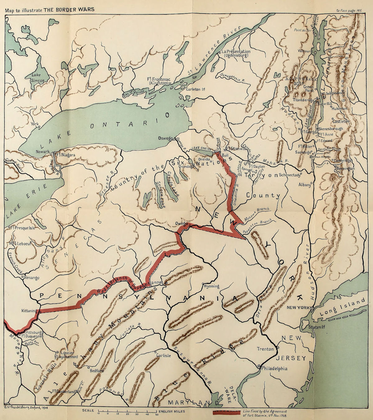 After General Forbes, in the late autumn of 1758, had taken Fort Duquesne, a new English fort, Fort Pitt, was in the following year built by General Stanwix upon the site of the French stronghold. The place was, as it had always been, the key of the Ohio valley, and on the maintenance of the fort depended at once the safety of the borderlands of Virginia and Pennsylvania, and the possibility of extending trade among the Indian tribes of the Ohio. In July, 1763, Fort Pitt was in a critical position. The posts which connected it with Lake Erie had been destroyed: the road which Forbes had cut through Pennsylvania on his memorable march was obstructed by Indians; and the outlying post along it, Fort Ligonier, about fifty-five miles east of Fort Pitt, was, like Fort Pitt itself, in a state of siege. The Indians were, as in the dark days after Braddock’s disaster, harrying the outlying homesteads and settlements, and once more the colonies were exhibiting to the full their incapacity for self-defence,[19] or rather, the indifference of the residents in the towns to the safety of their fellows who lived in the backwoods.