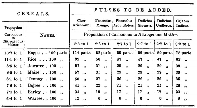 [496] Dr. Forbes Watson has made some very interesting calculations on the amount of pulses rich in nitrogen, which must be added to rice and other cereals comparatively poor in that constituent, in order that the mixture may contain the same proportion of carbonous to nitrogenous matter as is found in wheat, namely six to one. (See Table, next page.)