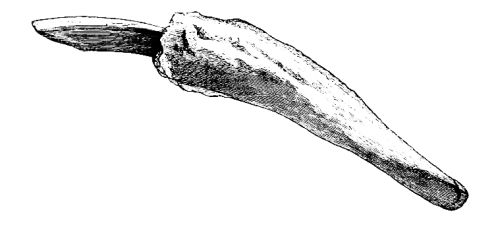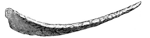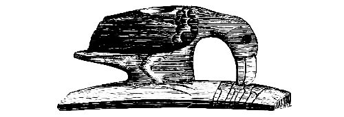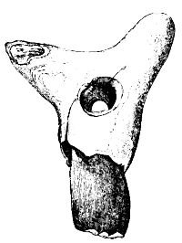 Notwithstanding the endless variety which characterises the ancient Mound-Builders’ pipes, one general type is traceable through the whole. A curved base forms the stem and handle, from the centre of which rises the bowl, as shown in Fig. 78, so that it is complete as found; whereas the modern Indian generally employs a pipe-stem, and ascribes to it the peculiar virtues of the implement. The medicine-man decorates it with his most elaborate skill, and it is regarded with awe and reverence by the whole tribe. The stem would seem, therefore, to be characteristic of the modern race; if indeed it be not the distinguishing memorial of an origin of the Northern tribes diverse from Toltecan and other ancient nations. One idea which such comparisons suggest is that in the sacred associations with the pipe of the Mound-Builders, we have indications of contact between a migrating race of Central or Southern America, where no superstitious pipe-usages have been found, and one of the Northern tribes among whom such superstitions are most intimately interwoven with all their sacred mysteries.