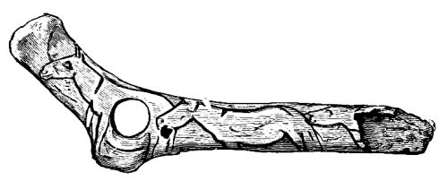 The importance of such evidence that the ancient dwellers in the Scioto Valley had some knowledge of tropical animals, and even of those confined exclusively to the southern continent, has not escaped the notice of the explorers of the mounds. It has even induced them to hesitate in assigning the name of the toucan to sculptures concerning the design of which there could be no other reasonable ground for doubt. Referring to the manatee sculptures, they remark: “These singular relics have a direct bearing upon some of the questions connected with the origin of the mounds. They are undistinguishable, so far as material and workmanship are concerned, from an entire class of remains found in them, and are evidently the work of the same hands with the other effigies of beasts and birds; and yet they faithfully represent animals found (and only in small numbers), a thousand miles distant upon the shores of Florida, or—if the birds seemingly belonging to the zygodactylous order be really designed to represent the toucan,—found only in the tropical regions of South America. Either the same race, possessing throughout a like style of workmanship, and deriving their materials from a common source, existed contemporaneously over the whole range of intervening territory, and maintained a constant intercommunication; or else there was at some period a migration from the south, bringing with it characteristic remains of the land from which it emanated. The sculptures of the manatees are too exact to have been the production of those who were not well acquainted with the animal and its habits.” Of the representations of the toucan, the accompanying woodcut (Fig. 81) will furnish a sufficient illustration. It is imitated with considerable accuracy, though inferior to some of the finest specimens of mound sculpture. The most important deviation from correctness of detail is, that it has three toes instead of two before, although the two are correctly represented behind. It is stooping its head to take food from a rudely outlined human hand; and as it is known that the brilliant plumage of the toucan leads to its being frequently tamed by the natives of Guiana and Brazil, this tends not only to confirm the idea of its representation by the sculptures in question: but to suggest that the Mound-Builders may have had aviaries, like those in which the Aztec caciques assembled birds of splendid plumage and beautiful form from every part of their Mexican empire.