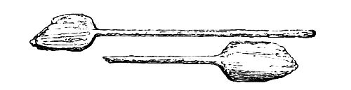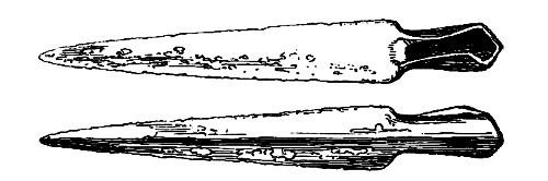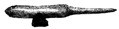 What such relics record in reference to metallurgy has already been seen. The Mound-Builders were acquainted with several of the metals. They had both the silver and lead of Iowa and Wisconsin in use. Implements and personal ornaments of copper abound on their altars; and the mechanical combination of silver with the native copper of which those are made, indicates that they derived their supplies from Lake Superior, where alone the metals have hitherto been found in the singular mechanico-chemical combination of crystals of silver in a copper matrix. Their sacrificial fires have in some cases fused the metallic offerings on the altars into a mass of molten metal, so that the Mound-Builders had thus presented to them this all-important lesson of metallurgy. Mr. F. S. Perkins, of Burlington, Wisconsin, whose collection of native copper implements numbers upwards of sixty specimens, has arrived at the conclusion that some of those from the ancient mounds have been cast in moulds; and Mr. J. W. Foster concurs in the belief that the Mound-Builders had learned to smelt the ores.[101] This still requires further proof. At Cincinnati, I saw in the collection of Mr. Cleneay, a choice specimen of a copper axe, found on the banks of Hog Creek, a tributary of the Great Miami. It measures fifteen inches long, and weighs 5 lb. 5½ oz.; but though well-proportioned, and finished with unusual care, it is entirely the work of the hammer. Only in one case, of an axe from the Lockport Mound, have I seen indications which seem to suggest a process of casting. But specimens of accidentally melted copper repeatedly occur; and Mr. Jas. B. Skinner, of Cincinnati, showed me a melted mass of pure silver, of 4 lb. weight, found lying on a heap of charcoal, in cutting through the embankment surrounding a large mound at Marietta. Nothing further was needed than the practical sagacity by which similar accidents have been turned to account, to lead the Mound-Builders one step beyond this, to the use of the crucible and the mould. It would not, therefore, surprise me to find partial traces of the use of both. Their imitative skill, and ability in modelling, had already taught them the use of the mould when working in clay. But they had, at best, a very rudimentary knowledge of metallurgy; they do not appear to have acquired, by barter or otherwise, any specimens of the alloyed metals; and only mechanically combined their copper with silver. Hematite, though prized by them, was used simply as a stone. They were familiar with silver, and shaped it into many personal ornaments. The sulphuret of lead was also known to them; and was turned to account both for use and ornamentation.