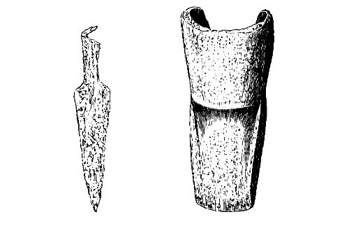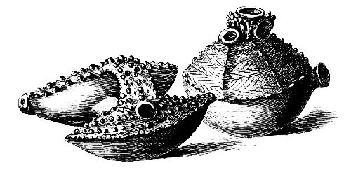 The correspondence between the forms and ornamentation of the rudest classes of pottery of the Old and New World, appears, at first sight, remarkable; but it originates in the inartistic simplicity inseparable from all infantile art. The ornamentation is only an improvement on the accidents of manufacture. The first decorations of the aboriginal potters of Europe and America appear to have been an undesigned result of the twisted cords passed round the clay to retain its form before it was hardened in the fire. More complicated patterns were produced by plaited or knitted cords, or imitated in ruder fashion with the point of a bone-lance or bodkin. But it is only among the allophylian arts of Europe that such arbitrary patterns are perpetuated with improving taste and skill. The European vase and cinerary urn become more graceful in contour, and more delicate in material and construction, when they accompany the beautiful weapons and personal ornaments wrought in bronze. But no attempt is made to imitate leaf or flower, bird, beast, or any simple natural object; and when in the bronze work of the later Iron Period, imitative forms at length appear, they are chiefly the snake and dragon patterns, borrowed seemingly by Celtic and Teutonic wanderers, with the wild fancies of their mythology, from the eastern cradle-land of their birth.