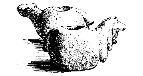 With one or two stray exceptions, objects precisely similar to the mound sculptures have not hitherto been met with, beyond the valleys where other traces of the Mound-Builders abound; but the points of resemblance between the sculptured mound-pipes and numerous miniature stone mortars found in Peru are too striking to be overlooked. Of the two examples given here (Fig. 83), the one is a llama, from Huarmachaco, in Peru, in the collection of the Historical Society of New York. It is cut in a close-grained black stone, and measures four inches long. The other, of darkish brown schist, is from a drawing made by Mr. Thomas Ewbank, while in Peru. The greater number of those seen by him represent the llama and its congeners, the alpaca, guanoco, and vicuna. They are all hollowed precisely like the bowl of the sculptured mound-pipes, but have no lateral perforation or mouth-piece. Their probable use was as mortars, in which the Peruvians rubbed tobacco into powder, working it with a small pestle until it became heated with the friction, when it was taken as snuff. The transition from this practice to that of inhaling the burning fumes is simple; and the correspondence between the ancient Peruvian tobacco-mortar and the stone pipe of the Mound-Builder is worthy of note, when taken into consideration along with the imitations of birds of the southern continent found among the sculptures of the mounds. Dr. Tschudi describes four of the Peruvian mortars preserved at Vienna, carved in porphyry, basalt, and granite; and he adds: “How the ancient Peruvians, without the aid of iron tools, were able to carve stone so beautifully, is inconceivable.”