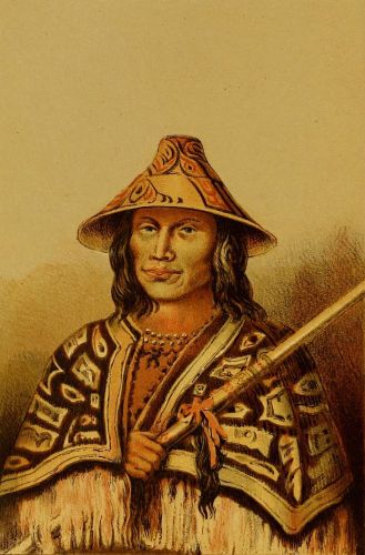 But the most elaborate and curious specimens of pipe-sculpture are those executed by the Chimpseyan or Babeen Indians, who also carve skilfully in wood and bone. They display much ingenuity in grass-plaiting for hats and waterproof baskets, or kettles; and in the manufacture of basket-nets of wicker-work, with which they catch the ulikon, a kind of smelt abundant in the rivers along their coast. They are, indeed, pre-eminent among the savages of the North Pacific coast for artistic skill; yet to all appearance, in the collision with the whites, their extermination is inevitable at no distant date. The frontispiece, Plate 1. illustrates the characteristic physiognomy of this people. It is the portrait of Kaskatachyuh, a Chimpseyan chief, from sketches taken by Mr. Paul Kane, while travelling in their country. He wears one of the native hats made of dyed and plaited grass. The Chimpseyans belong to the Thlinket stock, tribes of which extend as far north as Behring Bay. They do not feast on the whale, because it is one of their tribal totems; but the blubber of the porpoise and seal is a favourite delicacy. The Babeens or big-lip Indians,—as the Chimpseyans are most frequently called,—have received this name from the deformation of the under-lip in the women of the tribe, produced by the insertion of a piece of wood into a slit made in infancy, and increased in size until the lip protrudes like the bill of a duck; and among the wooden masks which they carve of life-size, this protruding lip is the invariable characteristic of those of the women. Other and not less singular customs mark the distinction between the sexes, and are perpetuated even after death. Their women are wrapped in mats and placed on an elevated platform, or in a canoe raised on poles, while the bodies of the males are invariably burned. The Chimpseyans and the Clalam Indians, occupying Vancouver’s Island and the coasts in the neighbourhood of Charlotte’s Sound, carve bowls, platters, and other utensils out of a blue claystone or slate, from which also they make their pipes, and decorate them with many ingenious and grotesque devices. One of the smaller and simpler of these pipes, shown in Fig. 85, is placed here alongside of a chef-d’œuvre of Pabahmesad, the Chippewa artist. Nothing could better serve to illustrate the contrast between the ingenious imitative art of Algonquin pipe-sculpture and the exuberant fancifulness of the Babeen carvings. Large and complicated designs are common, sometimes inlaid with bone or ivory, and embracing every native or foreign object adapted to the sculptor’s fancy. The same talent for carving finds room for its display on their ivory combs; and on ladles and spoons made from the horns of a mountain goat, which is one of the principal animals that they hunt on land. The claystone carvings of strictly native design chiefly occur on their pipe-sculptures, and consist of human figures, and of strange monstrosities intermingling human and brute forms, in which curious analogies may frequently be traced to the sculptures of Central America. But the powers of observation and imitation are most strikingly illustrated in claystone carvings of objects of foreign origin. The collections formed by the United States Exploring Expedition, now at Washington, include numerous specimens of this class, representing European houses, forts, boats, horses, and fire-arms; and reproducing in minute detail the cords, pulleys, and other minutiæ of the shipping which frequent the coast. The example shown in Fig. 86 is a curious combination of native and foreign elements; and may be regarded as the conventional representation by the native artist of a bear hunt in the vicinity of one of the Hudson Bay Company’s stations. The animal-heads on some of the human figures represent the grotesque masks already referred to as among their favourite carvings, and a special branch of native art. They are executed in wood, the size of life, and brilliantly coloured; and are worn in the grand dances of the tribe.