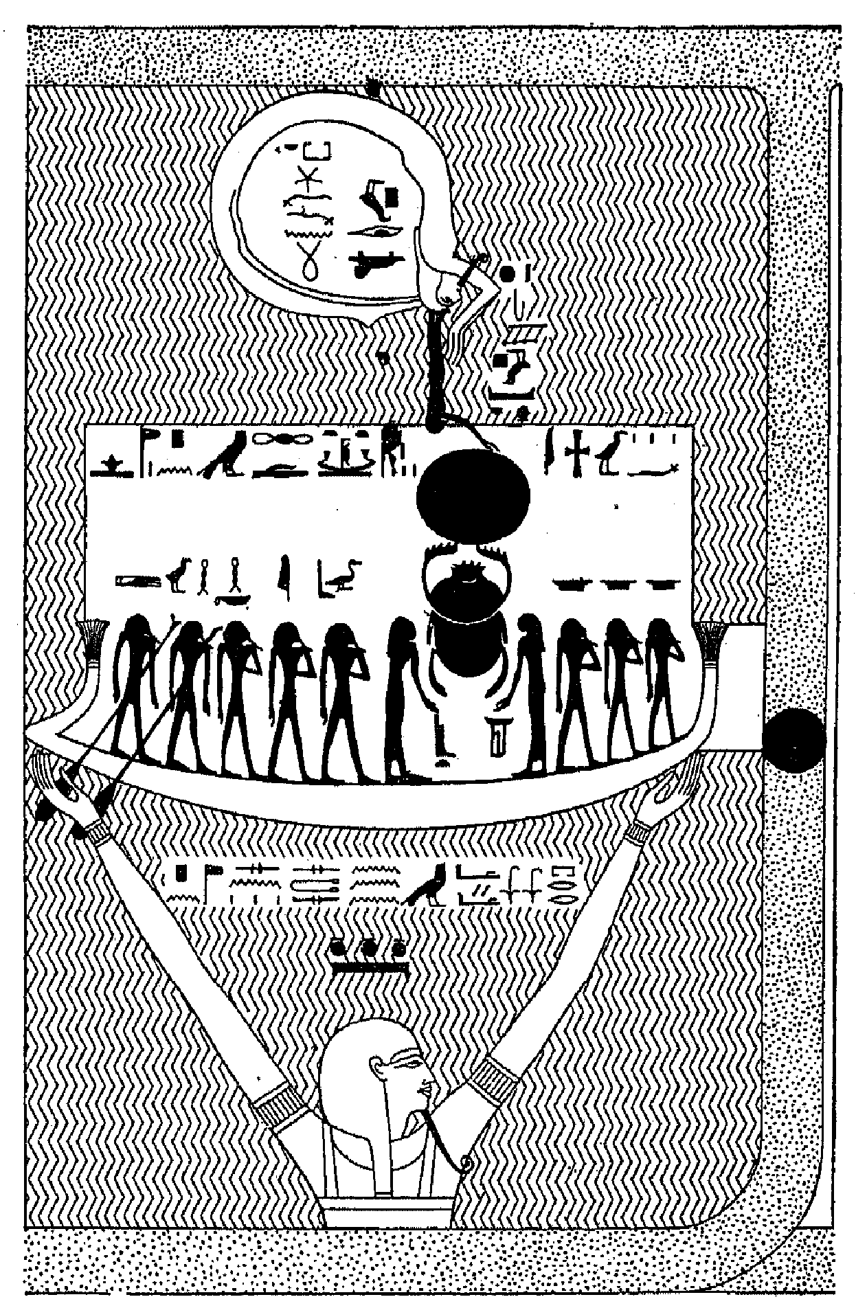 THE CREATION. The god Nu rising out of the primeval water and bearing in his hands the boat of Rā, the Sun-god, who is accompanied by a number of deities. In the upper portion of the scene is the region of the underworld which is enclosed by the body of Osiris, on whose head stands the goddess Nut with arms stretched out to receive the disk of the sun.