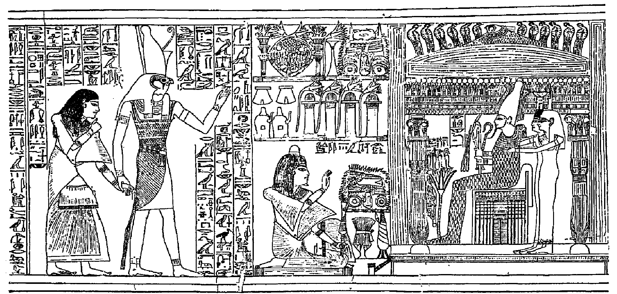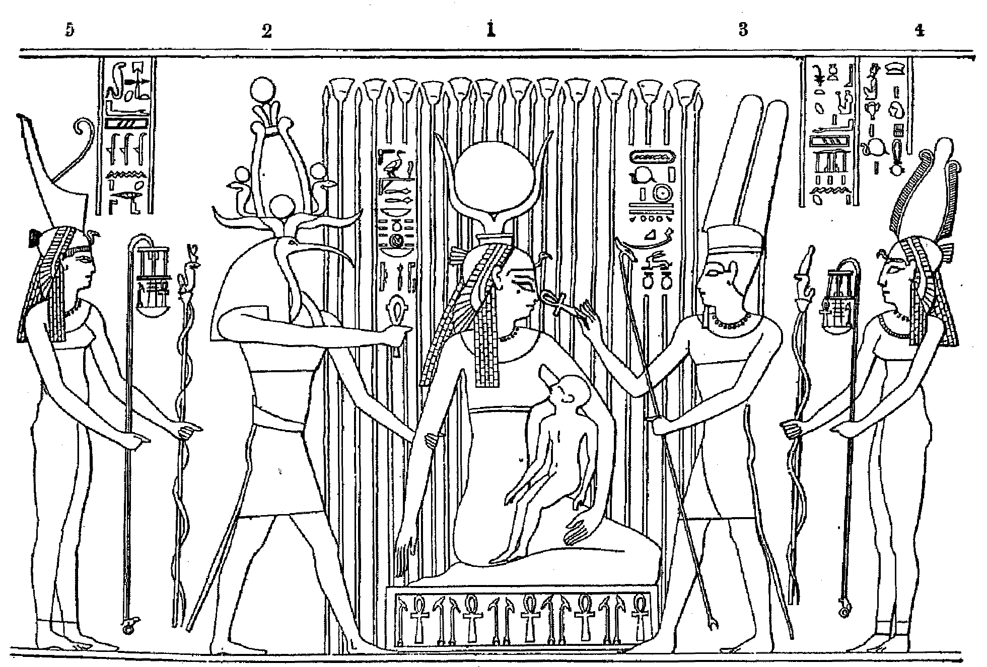 2. Thoth giving the emblem of magical protection to Isis. 3. Amen-Rā presenting the symbol of "life" to Isis. 4. The goddess Nekhebet presenting years, and life, stability, power, and sovereignty to the son of Osiris. 5. The goddess Sati presenting periods of years, and life, stability, power, and sovereignty to the son of Osiris. |