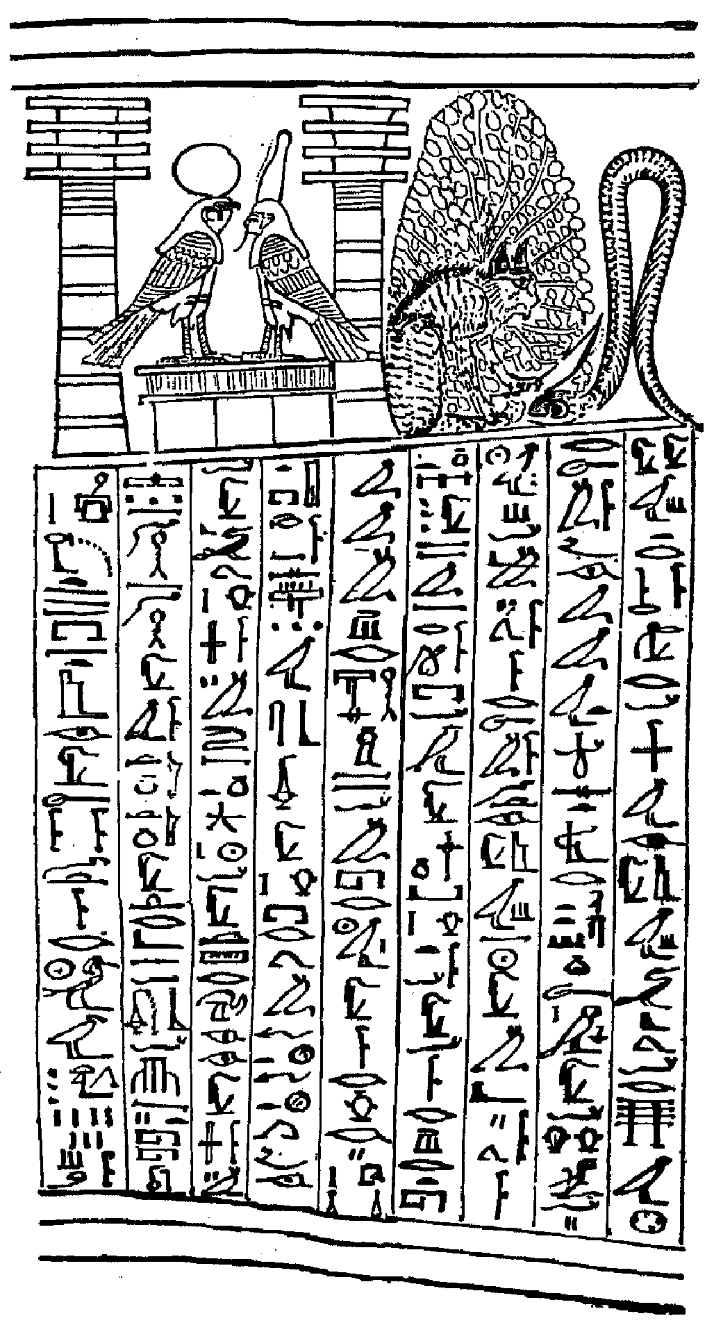 "The god Horus maketh himself to be strong like unto the Hawk which is one thousand cubits in length, and two thousand [cubits in width] in life; he hath equipments with him, and he journeyeth on and cometh where his heart's throne wisheth to be in the Pools [of Hetep] and in the cities thereof. He was begotten in the birth-chamber of the god of the city, offerings of the god of the city are made unto him, he performeth that which it is meet to do therein, and causeth the union thereof, and doeth everything which appertaineth to the birth-chamber of the divine city. When he setteth in life, like crystal, he performeth everything therein, and the things which he doeth are like unto the things which are done in the Lake of Twofold Fire, wherein there is none that rejoiceth, and wherein are all manner of evil things. The god Hetep goeth in, and cometh out, and goeth backwards [in] that Field which gathereth together all manner of things for the birth-chamber of the god of the city. When he setteth in life, like crystal, he performeth all manner of things therein which are like unto the things which are done in the Lake of Twofold Fire, wherein there is none that rejoiceth, and wherein are all manner of evil things.