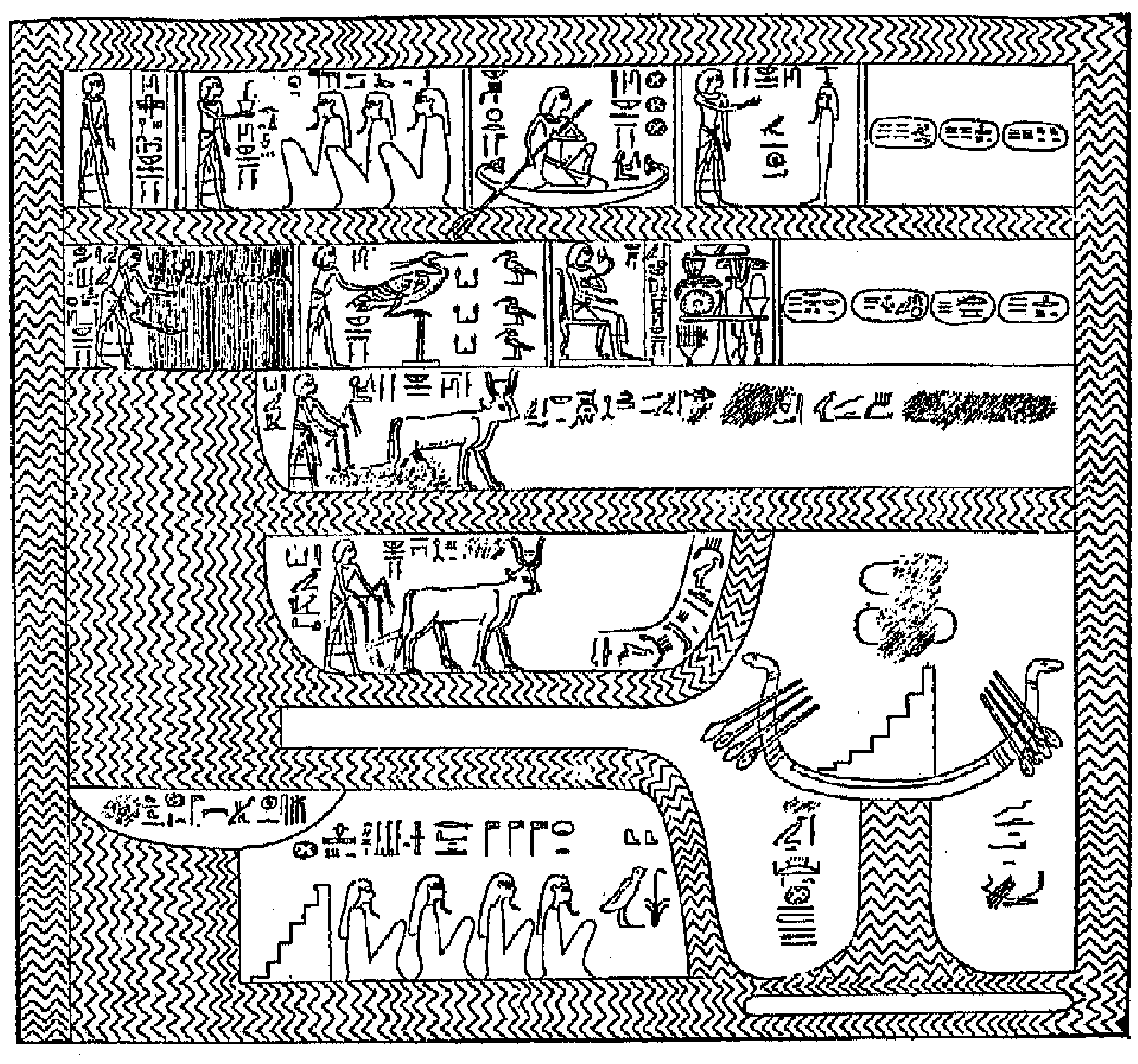 15. The boat Tchetetfet, with eight oars, four at the bows, and four at the stern, floating at the end of a canal; in it is a flight of steps. The place where it lies is called the "Domain of Neth."