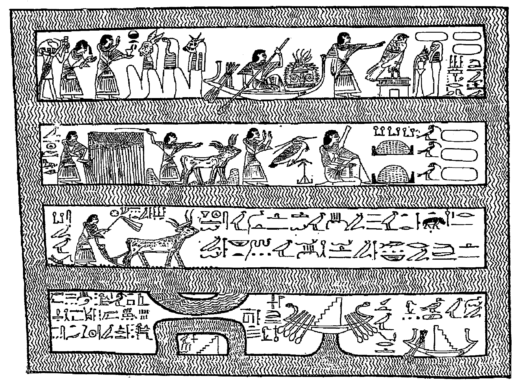 1. Ani making an offering before a hare-headed god, a snake-headed god, and a bull-headed god; behind him stand his wife Thuthu and Thoth holding his reed and palette. Ani paddling a boat. Ani addressing a hawk, before which are a table of offerings, a statue, three ovals, and the legend, "Being at peace in the Field, and having air for the nostrils."