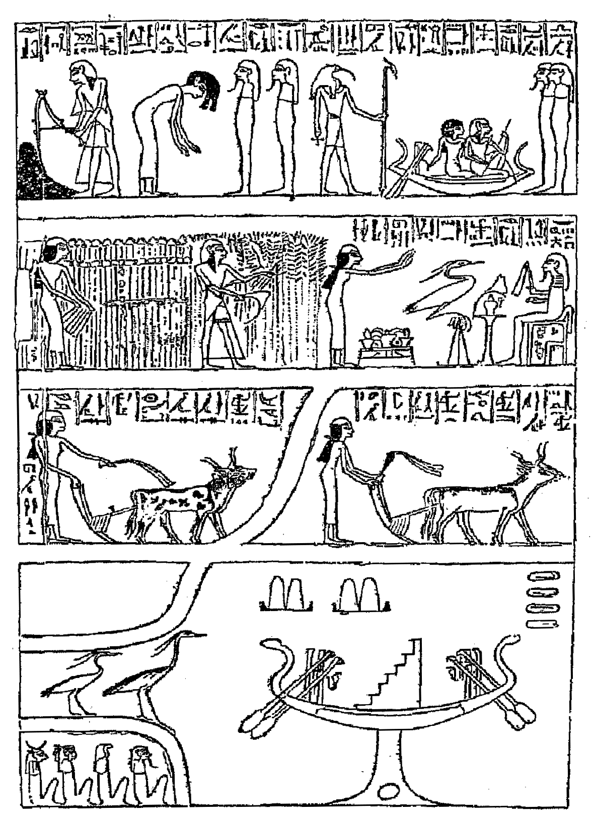 2. Ani reaping corn, Ani driving the oxen which tread out the corn; Ani addressing (or adoring) a Bennu bird perched on a stand; Ani seated holding the kherp sceptre; a heap of red and a heap of white corn; three KAU and three KHU, which are perhaps to be read, "the food of the spirits;" and three Pools.