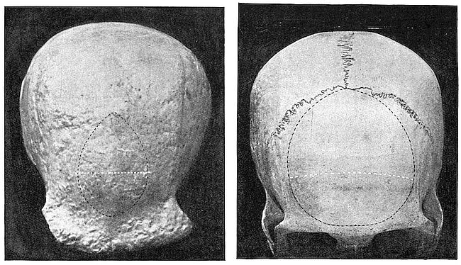 The line A C is drawn as a straight line joining A and C—but if the skull is accurately posed it corresponds to the edge of the plane at right angles to the sagittal plane of the skull—which traverses both bregma (C) and ophryon (A)—and where it ‘cuts’ the skull marks off the prefrontal area or boss. (See for the full-face view of this area in the two skulls—Figs. 1 and 2.) The line d is a perpendicular let fall from the point of greatest prominence of the prefrontal area on to the prefrontal plane. It indicates the depth of the prefrontal cerebral region. Drawn on both sides on the surface of the bone and looked at from in front (the white dotted line in Figs. 1 and 2) it gives the maximum breadth of the prefrontal area.