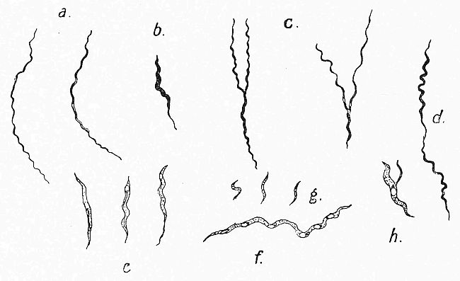 One very astonishing and revolutionary fact discovered by Schaudinn we must, however, especially point out. Medical men have long been acquainted with the spirillum, or spiral threads, discovered by Obermeyer in the blood of patients suffering from the relapsing fever of eastern Europe. These were universally and without question regarded as Bacteria (vegetable organisms) and referred to the genus “Spirochæta” of Ehrenberg. They were called Spirochæta Obermeieri; and relapsing fever was held to be a typical case of a bacterial infection of the blood.[182] It is now shown by Schaudinn that the blood-parasite spirochæta is a phase of a trypanosome (fig. 54); that it has a large nucleus and a micronucleus or blepharoplast, neither of which are present in the spiral Bacteria; and, further, that it alters its shape, contracting so as to present the form of minute oval or pear-shaped bodies, each provided with a larger and a smaller nucleus (fig. 54, E, F). These oval bodies are often engulfed by the colourless corpuscles (phagocytes) of the blood; and it is in the highest degree probable that in this condition they have been observed in some tropical diseases without their relation to the spiral forms being suspected. The corpuscles lately described[183] by Leishman, in cases of a peculiar Indian fever, are very probably of this nature, as are also similar bodies recently described in Delhi sore. On the whole, it may safely be said that the researches of Dr. Schaudinn, of which only a preliminary account has yet been published, have widely modified our conceptions as to these blood-parasites, and must lead to important discoveries in regard to diseases caused by them in mammals and in man.