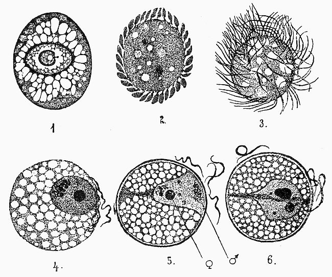 Each of these penetrates and fuses with the substance of a female Trypanosome, swallowed at the same time or already taken in by the gnat. The fertilized animalculæ is the vermiform motile stage of Fig. 52, A; and so we return to the starting-point of the cycle (after Schaudinn).
